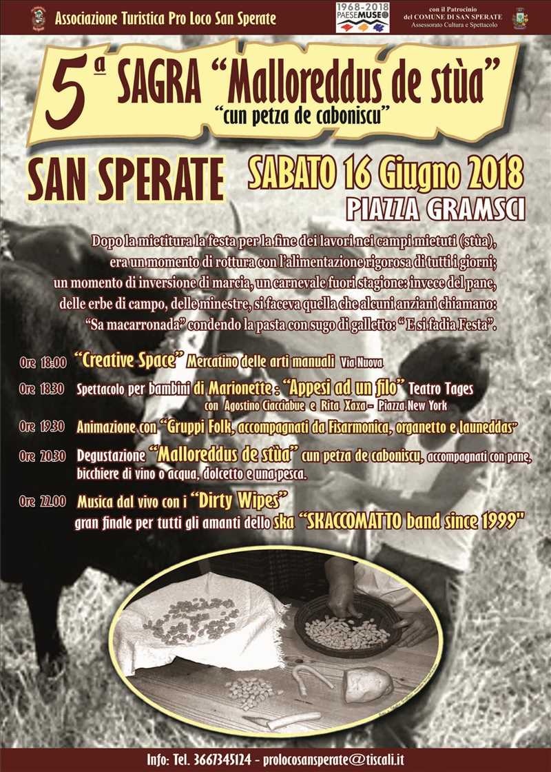 la sagra dei Malloreddus de stùa cun petza de caboniscu, in programma sabato 16 giugno 2018 a San Sperate, vedrà l'esibizione dei Dirty Wapes e degli Skaccomatto, oltre che la degustazione gastronomica e lo spettacolo di marionette